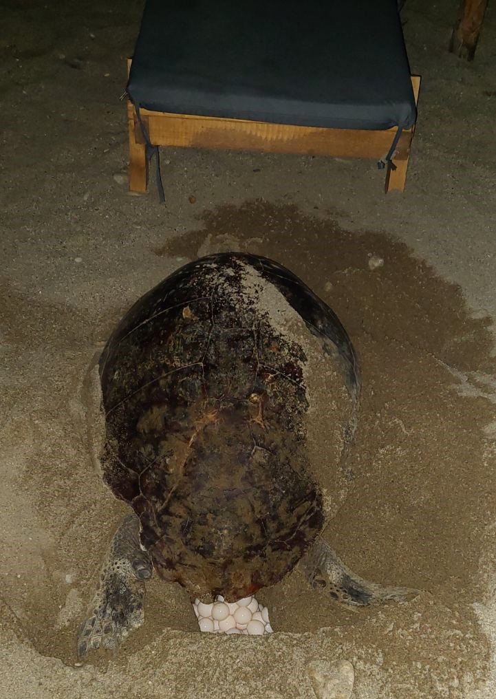 Ανάμεσα σε ξαπλώστρες και ομπρέλες έκανε τα αυγά της μια χελώνα στην παραλία Δαμνόνι, νότια του νομού Ρεθύμνης, μεταξύ της Μονής Πρέβελη και του Πλακιά.