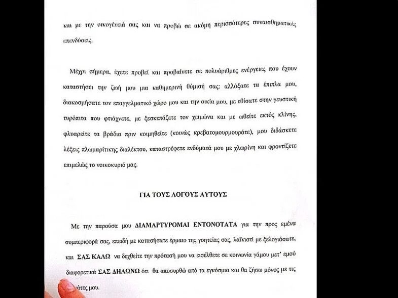 «Με την παρούσα μου διαμαρτύρομαι εντονότατα για την προς εμένα συμπεριφορά σας, επειδή με καταστήσατε έρμαιο της γοητείας σας, λαϊκιστί με ξελογιάσατε και σας καλώ να δεχτείτε την πρότασή μου να εισέλθετε σε κοινωνία γάμου μετ’ εμού διαφορετικά σας δηλών ότι θα αποσυρθώ από τα εγκόσμια και θα ζήσω μόνος…» αναφέρει μεταξύ άλλων το εξώδικο.