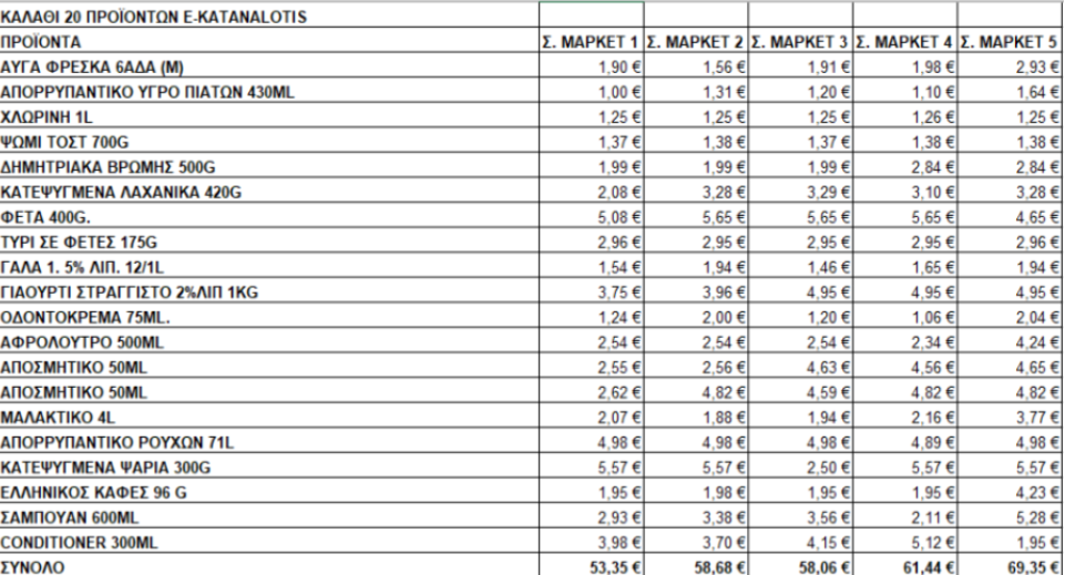 Σύγκριση τιμών στο e-katanalotis μεταξύ πέντε αλυσίδων σούπερ μάρκετ για καλάθι με τα ίδια 20 προϊόντα.