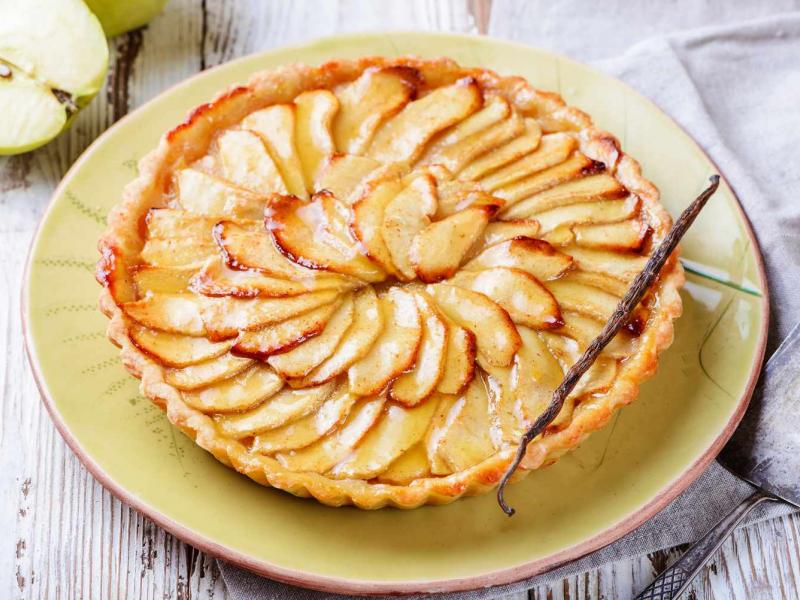 Μεταφέρουμε τα μήλα σε αντικολλητικό ταψάκι ή στρογγυλό πυρέξ και καλύπτουμε τον πάτο. Ανοίγουμε τη ζύμη με τον πλάστη και σκεπάζουμε τα μήλα. Τρυπάμε ελαφρά τη ζύμη με πιρούνι για να φύγει ο αέρας και να μην σκάσει στο ψήσιμο.