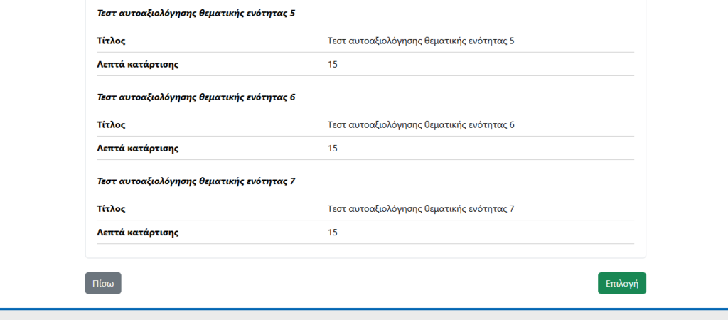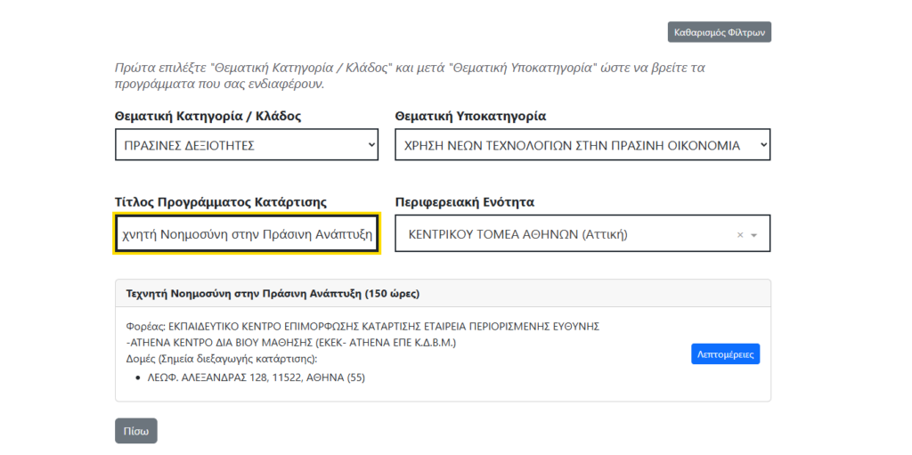 Γράφετε στο «Τίτλος Προγράμματος Κατάρτισης» το Τεχνητή Νοημοσύνη στην Πράσινη Ανάπτυξη– και πατάτε λεπτομέρειες – στη συνέχεια πατάτε “ΕΠΙΛΟΓΗ” (ΠΡΟΣΟΧΗ θα πρέπει να αντιγράψετε το Τεχνητή Νοημοσύνη στην Πράσινη Ανάπτυξη και να το επικολλήσετε στο πεδίο ή να γράψετε τα πρώτα γράμματα που δεν έχουν τόνο για να σας το εμφανίσει)