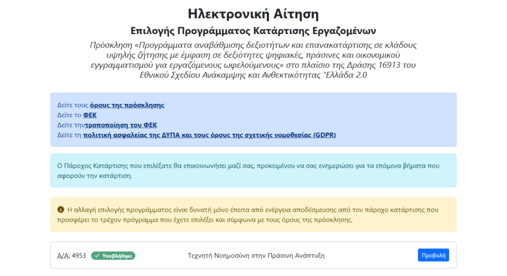 Επιλέγετε πάροχο ΕΚΠΑΙΔΕΥΤΙΚΟ ΚΕΝΤΡΟ ΕΠΙΜΟΡΦΩΣΗΣ ΚΑΙ ΚΑΤΑΡΤΙΣΗΣ – ATHENA ΚΕΝΤΡΟ ΔΙΑ ΒΙΟΥ ΜΑΘΗΣΗΣ (ΕΚΕΚ ΑΤΗΕΝΑ ΚΔΒΜ ΕΠΕ). Θα πρέπει βλέπετε κατάσταση “υποβλήθηκε”