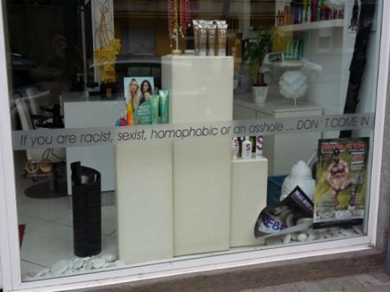 Η επιγραφή στο τζάμι του κομμωτηρίου λέει: «Αν είσαι ρατσιστής, σεξιστής, ομοφοβικός ή μαλάκας... ΜΗΝ ΕΡΘΕΙΣ ΜΕΣΑ».
