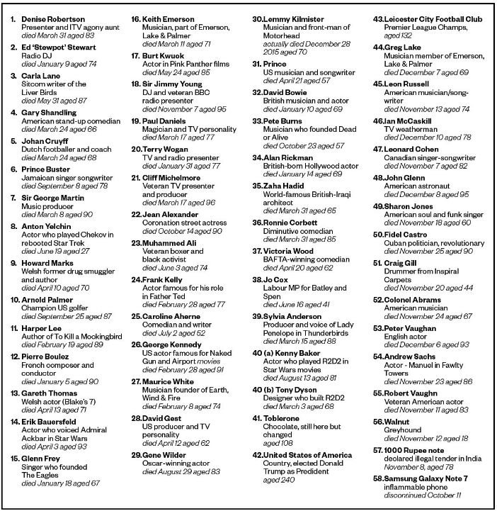 Ο Βρετανός καλλιτέχνης Chris Barker αποτίει φόρο τιμής στους εκλιπόντες του 2016 χρησιμοποιώντας το Sgt. Pepper's Lonely Hearts Club Band που είναι το εξώφυλλο του όγδοου άλμπουμ των Beatles και κυκλοφόρησε στις 1/6/1967