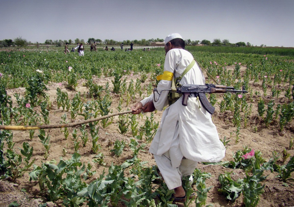 Σύμφωνα με τον διοικητή των ΗΠΑ στο Αφγανιστάν, στρατηγό, Τζον Νίκολσον, μια μόνο αφγανική επαρχία, η Χελμάντ, παράγει ένα σημαντικό μέρος του οπίου παγκοσμίως, το οποίο μετατρέπεται σε ηρωίνη και εξασφαλίζει περίπου το 60% της χρηματοδότησης των Ταλιμπάν. Ο πρόεδρος της χώρας, Ασράφ Γκανί, πρώην αξιωματούχος της Παγκόσμιας Τράπεζας, συμφωνεί: «Χωρίς ναρκωτικά αυτός ο πόλεμος θα είχε τελειώσει εδώ και καιρό. Η ηρωίνη είναι ένας πολύ σημαντικός μοχλός αυτού του πολέμου».