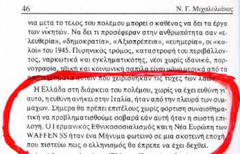 Ο υμνητής του ναζισμού, ο φυρερίσκος της «Χρυσής Αυγής», ο Ν. Μιχαλολιάκος, στο βιβλίο του με τίτλο «Για μια μεγάλη Ελλάδα σε μια ελεύθερη Ευρώπη», ανάμεσα στα άλλα «πατριωτικά» που αναφέρει μιλά και για τα WAFFEN SS. Αυτές ακριβώς τις ορδές των στυγνών δολοφόνων που κατέσφαξαν το Δίστομο, τις περιγράφει σαν... «Μήνυμα Φωτεινό» στην Ελλάδα και την Ευρώπη!