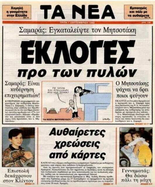 Είναι τελικά πολύ χρήσιμο να έχεις αρχεία των εφημερίδων και ιδιαίτερα ορισμένων εφημερίδων που εμπλέκονται στην πολιτική ζωή της χώρας. Δεν θα πάμε μακριά, δεν θα φτάσουμε στη δεκαετία του 1960, θα γυρίσουμε απλώς το ημερολίγο μόλις είκοσι χρόνια, το φθινόπωρο του 1993 όταν ο σημερινός πρωθυπουργός καλούσε τους βουλευτές να εγκαταλείψουν την κυβέρνηση Μητσοτάκη.