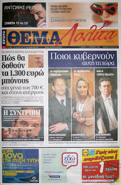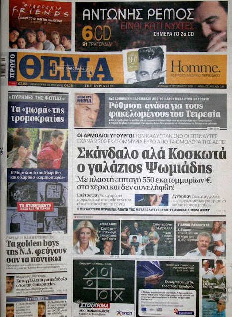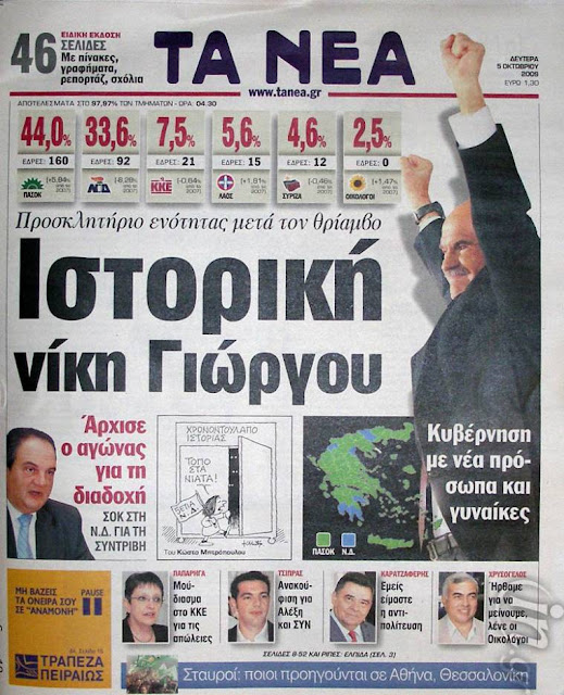 Δείτε τα πρωτοσέλιδα των μεγάλων εφημερίδων, λίγο πριν τις εκλογές του 2009, τα οποία παρουσίαζαν τον Γιώργο Παπανδρέου, ως τον απόλυτο ηγέτη που θα έσωζε την ΕΛΛΆΔΑ. Ας πάρουμε μια μικρή γεύση για το πώς τα ΜΜΕ, εδραίωναν και εδραιώνουν πολιτικούς φορείς και κυβερνήσεις διαμορφώνοντας γνώμες και συνειδήσεις. Κυβερνήσεις των οποίων τα αποτελέσματα της πολιτικής τους τα βιώνει ο λαός με τον πιο επώδυνο τρόπο.
