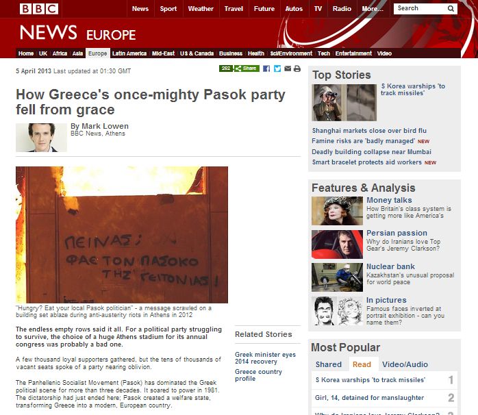 Το BBC φιλοξενώντας ένα σύνθημα σε τοίχο της Αθήνας που αναφέρει "«Πεινάς; Φάε τον Πασόκο της γειτονίας!» επι της ουσίας αναλύει τον επικήδιο του ΠΑΣΟΚ